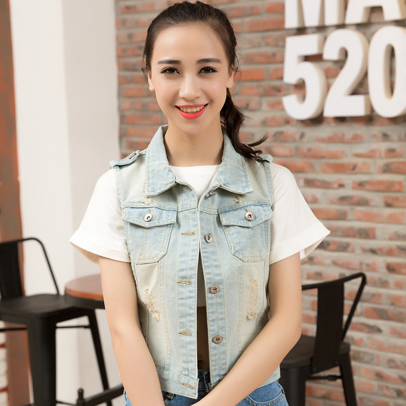 2024 Spring New Fashion Slim Ripped Denim Jacket Women's Short Sleeveless Denim Vest Pony Jacket Women