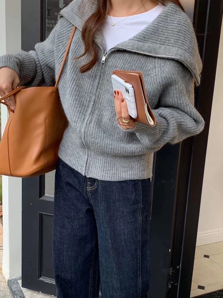 Double Zipper Lapel Navy Collar Knitwear for Women 2025 New Spring Lazy Style Cardigan Khaki Knitwear Jacket