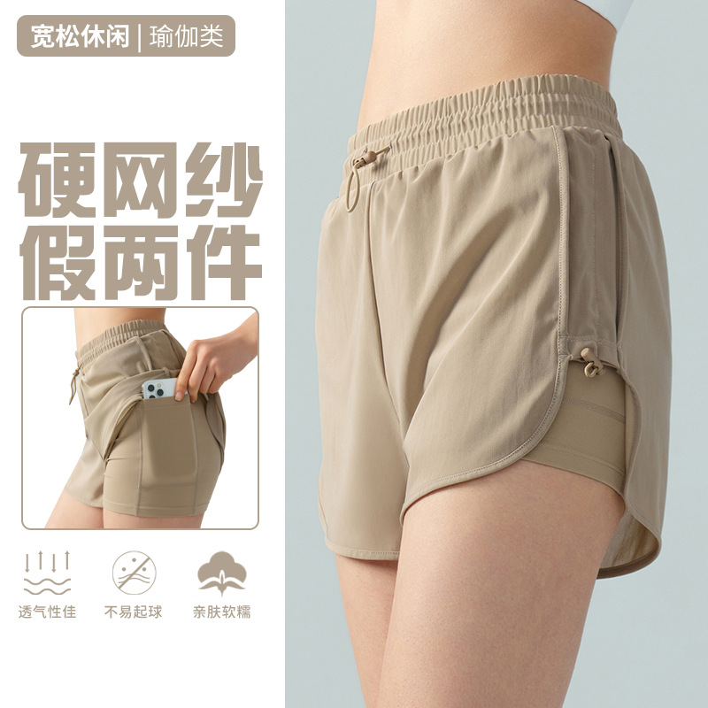 Fake Two-piece Waist Drawstring Sports Pants Women's Anti-walking Base Shorts High Waist Abdominal Tight Outdoor Sports Fitness Pants