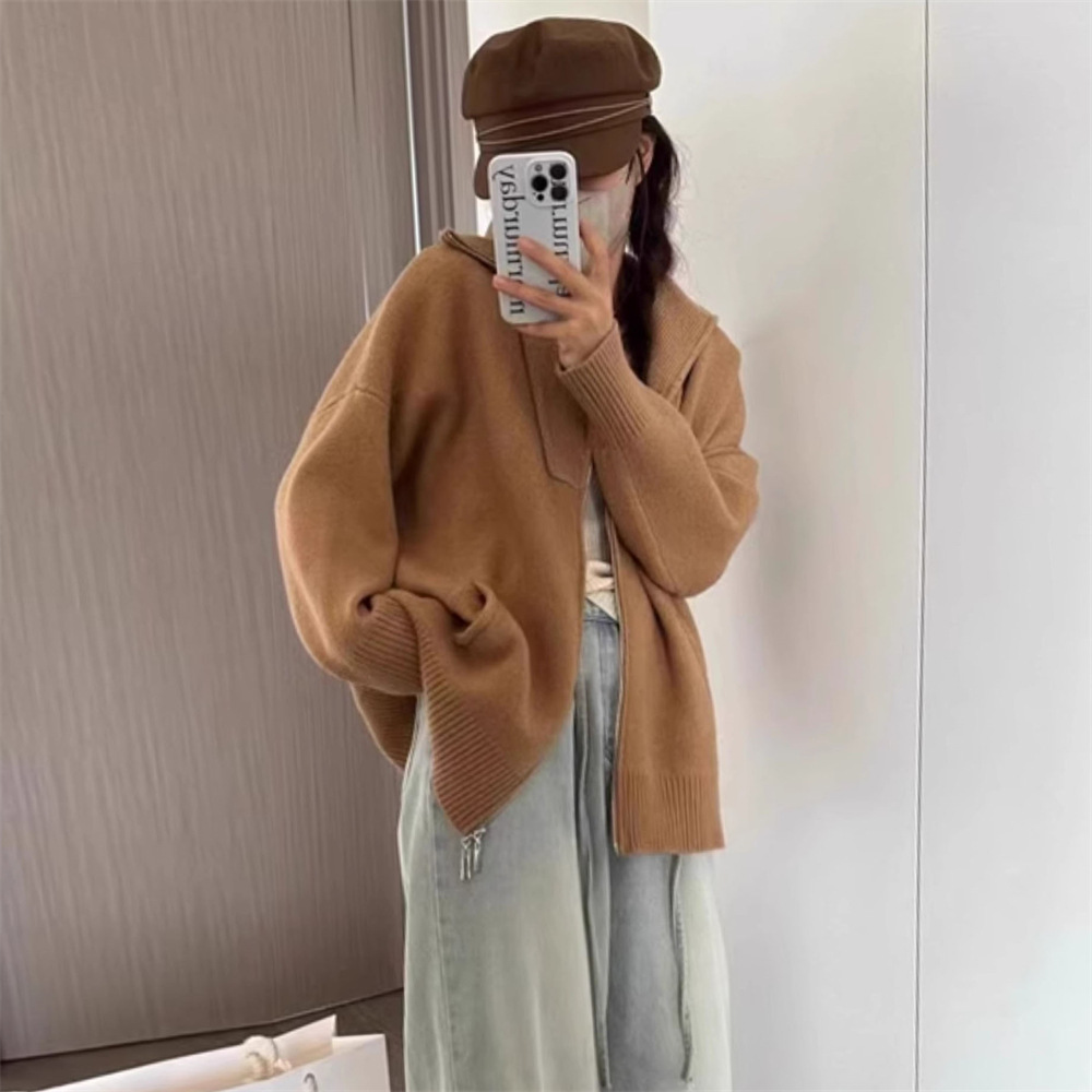 Korean Retro Lapel Loose Knitted Cardigan Jacket for Women Autumn and Winter New Lazy Style Double Zipper Sweater Women's Top