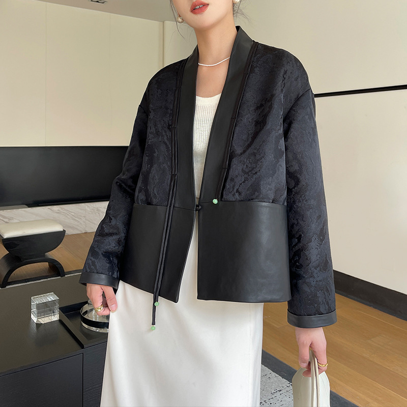 New Chinoiserie Genuine Leather Jacket for Women 2025 Spring New Chinoiserie Jacquard Top Spliced Goatskin Loose Outwear