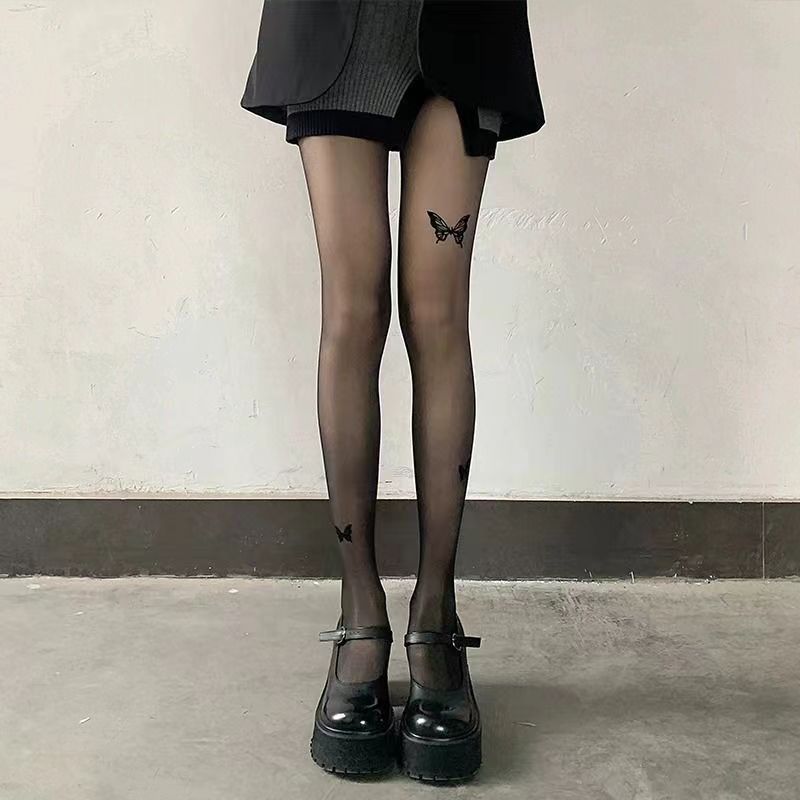 New White Silk Stockings Pure Anti-hook Silk Stockings Women's Spring and Autumn Black Butterfly Tattoo Printed Pants Leggings