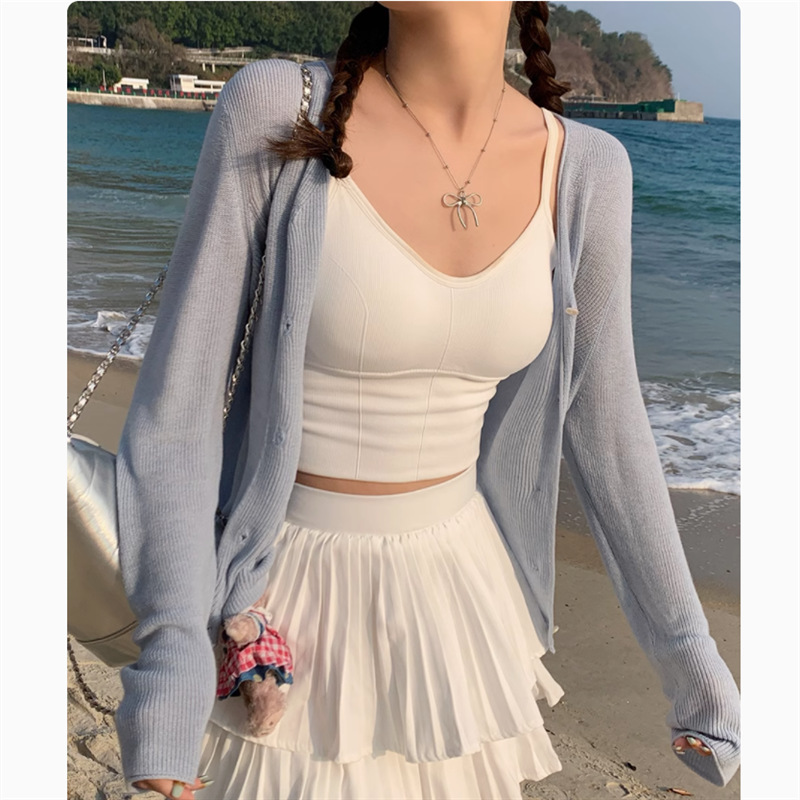 Red Ice Silk Sunscreen Knitted Cardigan Women's Summer Lightweight Small Shawl Outer Strap Tulle Coat Top