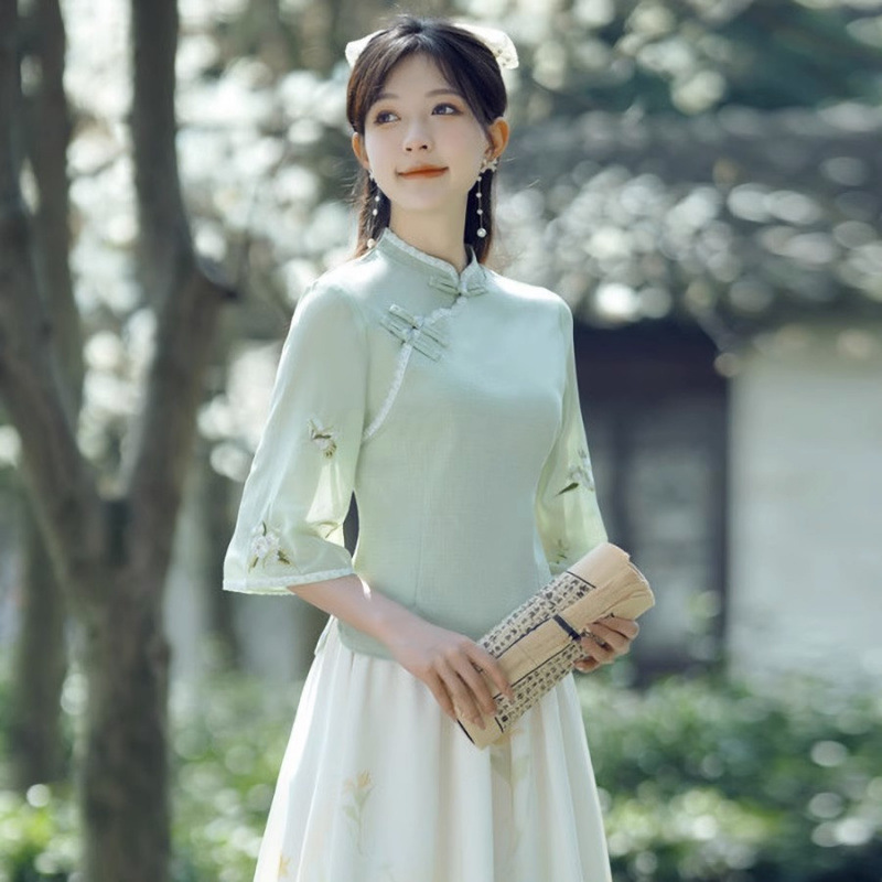 Republic of China Style Summer Women's Slim-fit Cheongsam Top Thin Han Element Hanfu suit Artistic Temperament Tang Suit Tea Art Clothing